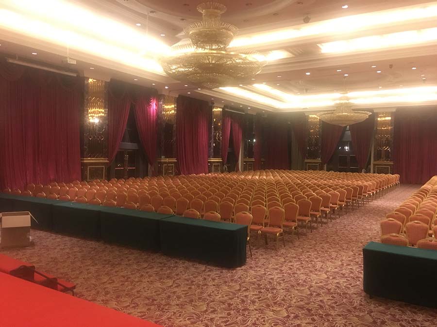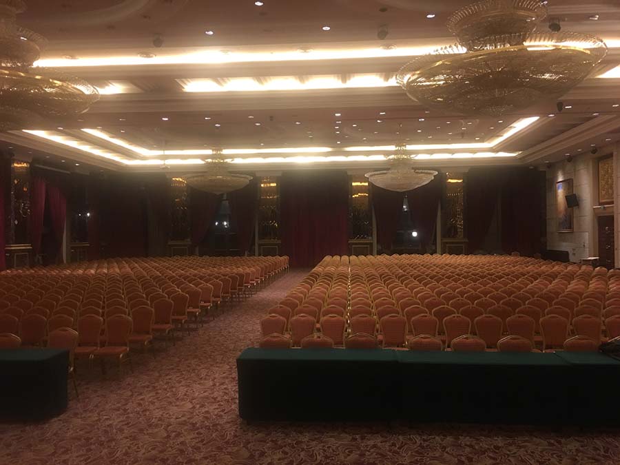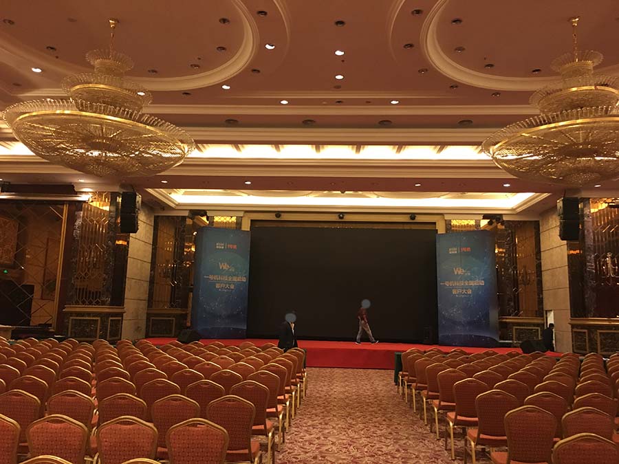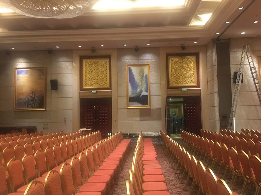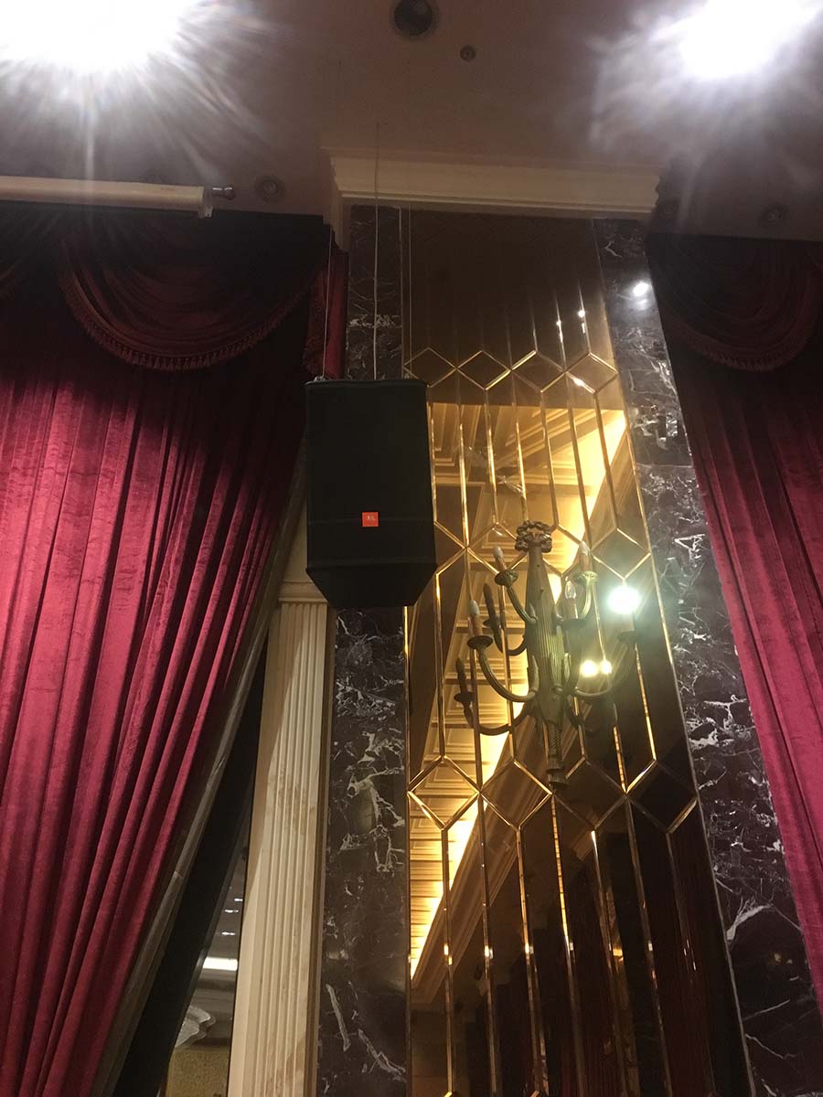 此次國際宴會廳1200平米,全部選用JBL音響,主音箱選用JBL線陣音箱,補聲音箱選用JBL CV系列音箱,返聽選用PRX400系列音箱。功放選用皇冠CROWN功放,BSS處理器以及萊斯康效果器,聲藝調音臺。
