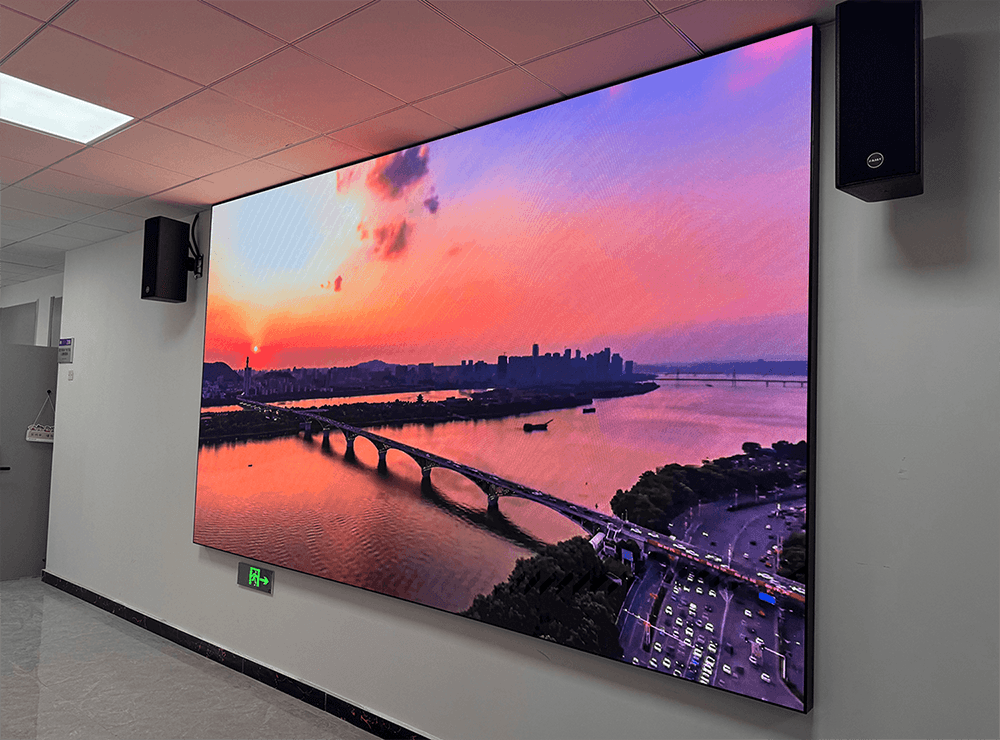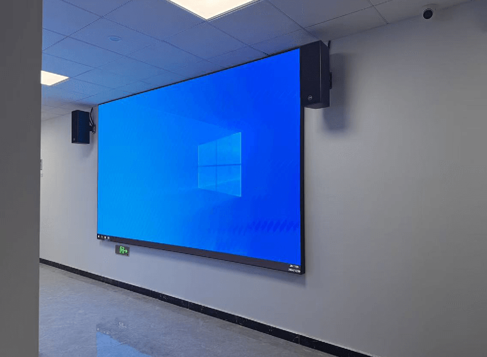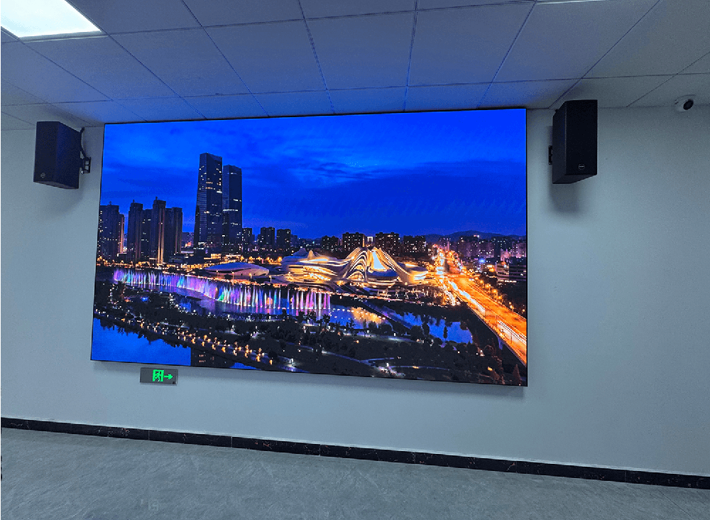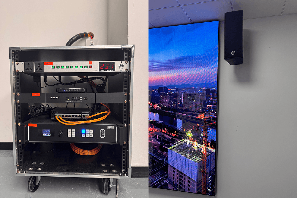 該工程采用了一塊強力巨彩8.6㎡的Q1.2大屏,左右兩邊各配置了一只EAJAX采用DANTE接口的雙6寸POE音箱,整套系統運行流暢,效果良好。