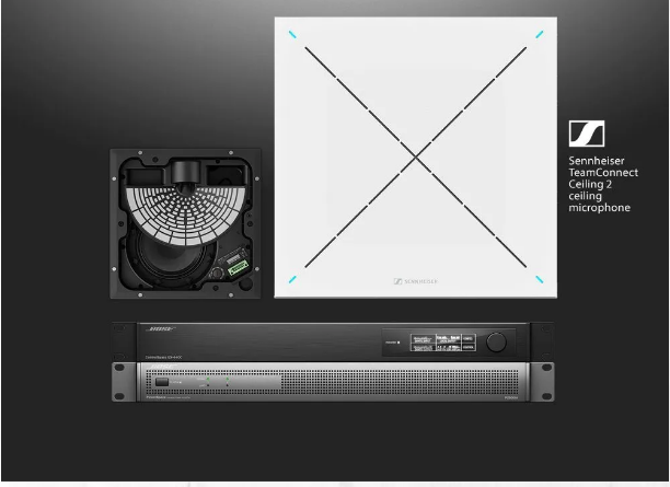ES1 系統在保證技術體驗的同時,又確保了美觀。這意味著無需在墻壁或桌面上安裝任何音頻設備,仍能同時確保人們無論在房間哪個位置,都能清晰通話,無礙溝通。該解決方案包含三款 Bose 產品:支持 DanteTM 的 ControlSpace EX-440C 遠程會議音頻處理器、EdgeMax EM180 邊界投射型吸頂揚聲器、PowerSpace P2600A 功放和 Sennheiser TeamConnect Ceiling 2 天花式吊頂陣列麥克風 (TCC2),它幾乎可為任何規模的會議室打造陳設現代、可靠耐用的會議體驗