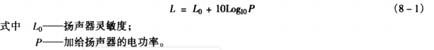 聲壓級的估算可以這樣進行,一種是一只揚聲器系統,則可根據揚聲器系統的額定功率,額定靈敏度來計算,揚聲器的靈敏度的單位是dB/m .W,表示給揚聲器加1W電功率,在原參考軸距揚聲器1m遠的位置(在揚聲器正前方)測出的聲壓級,揚聲器的在加額定功率時在1m處的聲壓級L(dB)可用式(8-1)計算