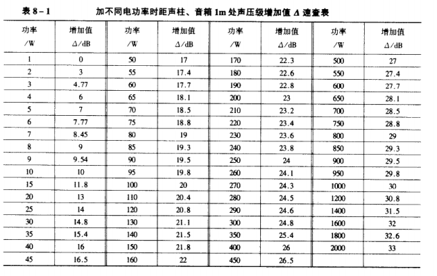 距聲柱、音箱1m處的總聲壓級為該聲柱、音箱的靈敏度加上根據其所加電功率從表8-1中查得的增加值,其計算公式為▲=10lgP,式中P為所加的電功率,單位為W。例如,某聲柱的額定電功率為50W,其靈敏度為98(dB.1m/1W)。則根據額定功率為59W從表8-1中可查到其增加值為17dB,加上靈敏度98dB,其和為115dB,所以給該聲柱加額定功率時,在距聲柱1m處的聲壓級將應為115dB。