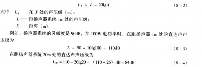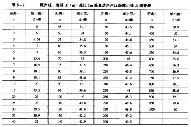 距聲柱、音箱X(m)處的直達聲聲壓級為該聲柱、音箱再加上其額定功電功率后的距離為1m處的聲壓級減去從表8-2中查得的減小值。其公式為▲=20logX,式中X為離聲柱或音箱的距離,單位為m。例如,某聲柱的額定電功率為50W,其在距離為1m處的聲壓級為115dB,設要求距離為50m處直達聲聲壓級,則根據距離為50m從表8-2中可查到其減小值為34dB,1m處的直達聲聲壓級115dB減去距離為50m時的減小值34dB,所以給該聲柱加額定功率時,在距聲柱50m處的直達聲聲壓級將應為81dB。