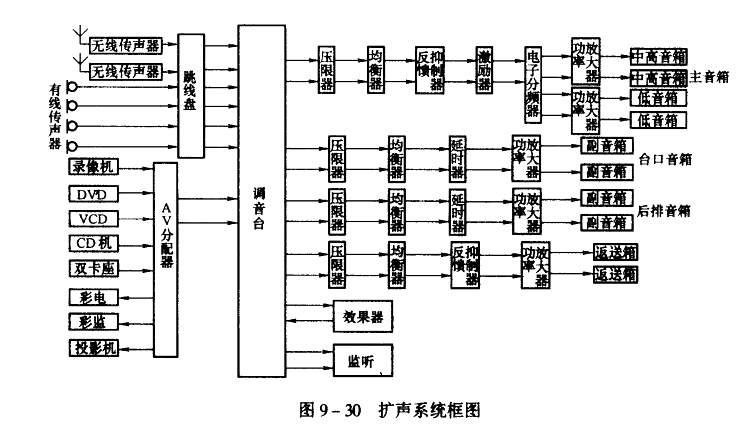擴聲系統框圖見圖9-30,在這張擴聲系統框圖中,主音箱采用由低頻音箱和中高頻音箱組成的揚聲器系統,所以在主音箱通路中加入了電子分頻器,并且使用兩臺功率放大器,一臺用來推動左右路低頻音箱,一臺用來推動左右路中高頻音箱,如果準備用低頻音箱加中頻音箱和恒指向高音號筒組成主揚聲器系統,則應選擇電子分頻器的型號,因為大多數電子分頻器是可以接成兩路兩分頻,一路三分頻的,有的電子分頻器可以接成兩路三分頻的,如果選用前一種電子分頻器,則主音箱通路要使用兩臺電子分頻器,左、右聲道各一臺電子分頻器,如果選用后一種電子分頻器,則使用一臺就可以了,無論使用哪種電子分頻器都應該改變成三臺功率放大器,一臺功率放大器用來推動低頻音箱,一臺用來推動中頻音箱,一臺用來推動恒指向高音號筒。