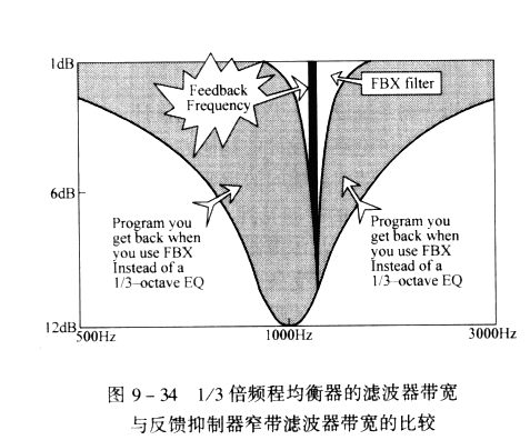 圖9-34是1/3倍平成均衡器的濾波器帶寬與反饋抑制器窄帶濾波器帶寬的比較,從圖上可以看出反饋抑制器的窄帶濾波器的帶寬遠遠比1/3倍頻程均衡器濾波器的帶寬小得多,當然反饋抑制器窄帶陷波濾波器對音質的影響也遠遠比1/3倍頻程均衡器小得多,圖9-35舉例說明,用1/3倍頻程均衡器抑制反饋和用反饋抑制器抑制反饋形成的頻率響應曲線比較,其中粗實線代表1/3倍頻程均衡器,細實線代表反饋抑制器窄帶陷波濾波器,顯然用反饋抑制器后的頻響曲線對音質的影響要好于用1/3倍頻程均衡器。