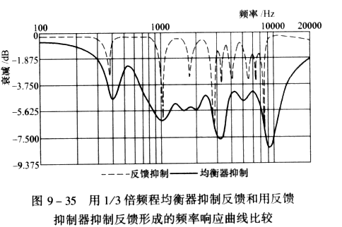 目前很多擴聲系統中配置有一種稱為反饋抑制器的設備,反饋抑制器首先由美國的賽賓公司研制出來,目前已有不少公司推出了相似功能的反饋抑制設備,甚至在新投放市場的數字音頻系統,例如數字媒體矩陣等設備中已經包含了反饋抑制器的功能,賽賓的反饋抑制器能根據蕭叫形成的機理,自動找到嘯叫頻率點,并且自動生成窄帶濾波器,降低以此頻率為中心的窄頻帶增益,從而破壞幅度平衡條件,達到使閉環放大倍數小于1的目的,使振蕩不能形成,這種反饋抑制器設置有兩種寬度的窄帶濾波器,一種為1/5倍頻程帶寬,一種為1/10倍頻程帶寬,無論是1/5倍頻程帶寬還是1/10倍頻程帶寬都遠遠比1/3倍頻程帶寬小得多,所以對音質的影響也遠遠比用1/3倍頻程均衡器抑制嘯叫小得多,而且原則上說在1/3倍頻程帶寬內出現梳狀濾波器效應,聽感上是聽不出來的,其與用1/3倍頻程均衡器抑制嘯叫的影響比較可以看圖9-34和圖9-35。